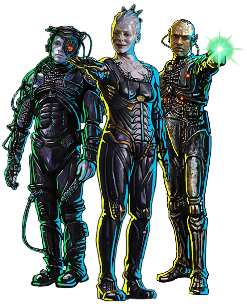 Die Borg sind eine weitestgehend humanoide Spezies aus dem Delta-Quadranten.[15] Der Ursprung der Borg ist rätselhaft, da es zu Beginn der Historie zahlreiche Klein-Kollektive gibt. Ähnlich wie die humanoide Form mehrere Male in der Milchstraße aufgrund der Bewahrer existiert, so entsteht auch das "Borg-Konzept" auf verschiedene Weisen in unterschiedlichen Epochen der Milchstraße.[16] Im 24. Jahrhundert hat sich das eine moderne "Borg-Kollektiv" etabliert, dass sich überall in der Milchstraße ausbreitet. Das oberste Bestreben der Borg besteht unter anderem darin andere Spezies und deren Technologie zu assimilieren, um der Perfektion immer näher zu kommen.