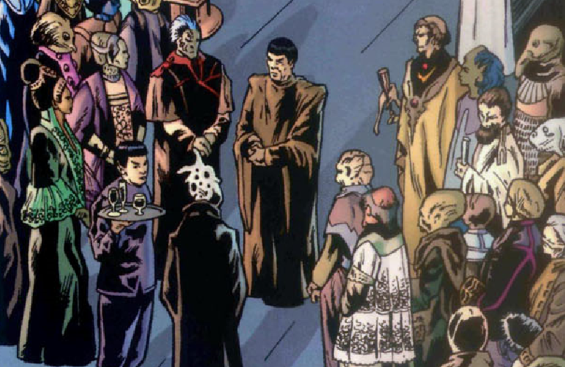 Spock versucht seinen Vater Sarek davon zu überzeugen, die Cardassianer in die politischen Angelegenheiten des Alpha-Quadranten mit einzubeziehen, dieser sieht in den Cardassianern jedoch opportunistische Gesellschaft, die der Föderation mehr schadet als hilft.[34]