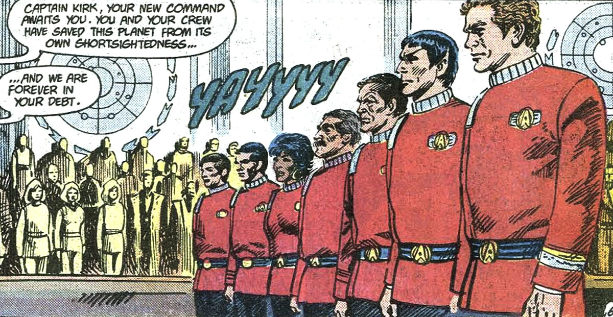 - The USS Enterprise crew are pardoned, and Rear Admiral James T. Kirk is demoted to captain. (TOS movie, novelization & comic adaptation: The Voyage Home, TNG - The Genesis Wave novel: Book One)