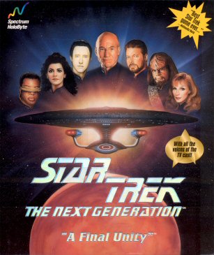 Star Trek: The Next Generation – A Final Unity is an adventure game by Spectrum HoloByte, based on the Star Trek universe. It puts the player in control of Captain Picard and his crew of the Enterprise D and features traditional point-and-click adventure game play as well as free-form space exploration, diplomatic encounters and tactical ship-to-ship combat.