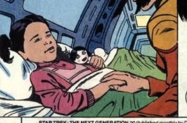 Alicia was an inhabitant of Beta Hydros IV colony when that world was struck by Zelaznan fever in the year 2367. Her mother assured her that the Federation starship USS Enterprise-D was on the way to cure her, although she secretly doubted the vessel would arrive in time to provide relief for the hospitals in the Alpha Hydros and Beta Hydros star systems. (TNG - The Star Lost comic: "The Flight of the Albert Einstein")