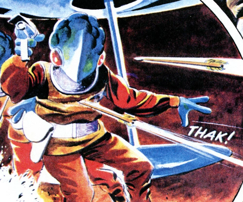 In 2265, rebel Muton natives led by Dalbar disguised themselves as jungle savages against invading frogmen by attacking with bows and arrows instead of directed energy weapons. (TOS comic: "Slaves of the Frogmen")