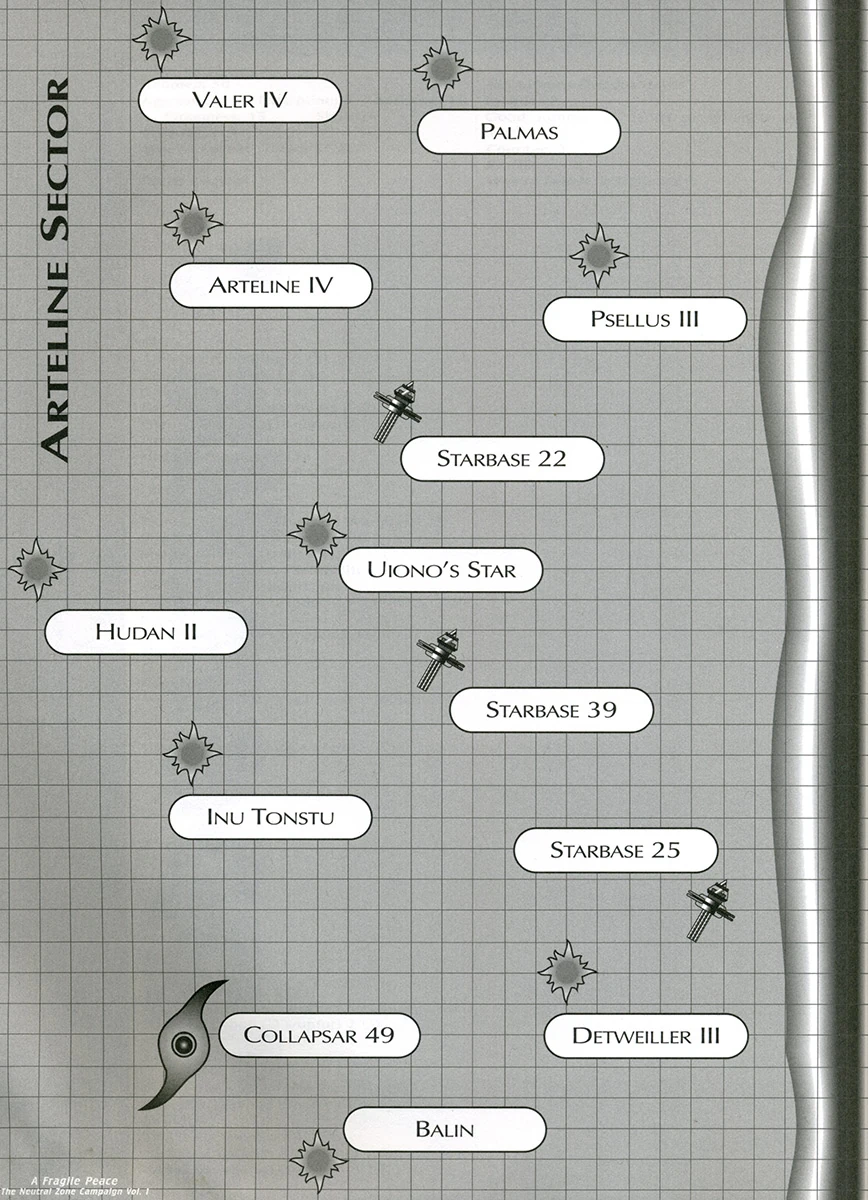 The Federation maintained starbases along the border and a colony on Valer IV. The indigenous Artelines of Arteline IV and the Pselliads of Psellus III were spacefaring species. The native Palmians of Palmas were non-spacefaring farmers. Several colonial mining outposts in the area were operated by the Harelians, an independent civilization from a neighboring sector. (Last Unicorn RPG module: TNG Core Game Book)
