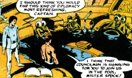 When the Council requested Federation humanitarian aid, Arvith met with Captain James T. Kirk and Commander Spock of the starship USS Enterprise, explaining the circumstances of their world's plague, famine, and economic collapse after the end of a lengthy, successful rebellion against the conquering Mirmonot. During a meeting with the other councillors in the amphibian-friendly Council chamber, General Onoth interrupted with news that Doctor Christine Chapel had been injured in an aircar crash. Arvith advised Kirk to be cautious around Onoth. (TOS comic: "Quarantine")