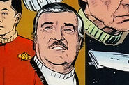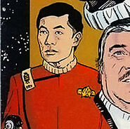 Kirk and Spock are met on the starbase by Commander Megor. They are then joined by Ambassador Sidak and T'Rin, his assistant. The two Vulcans inform Kirk and Spock that there will be no briefing on their mission; they are simply to enter a data device into the ship's computer which contains the specifications for their course and speed.