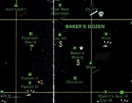Baker's World is a planet, the sixth planet in orbit of Baker's Star, located in the region of space known as The Triangle, and is the lead center for the Affiliation of Outer Free Worlds. It is Baker's World that is the source of the unofficial name for the AOFW, 'Baker's Dozen'.