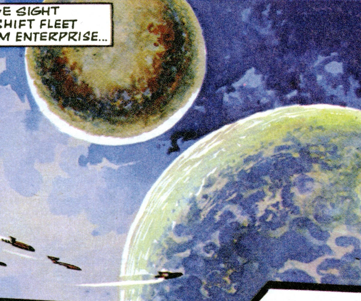In 2266, the starship USS Enterprise was attacked while exploring the system, forcing James T. Kirk to become involved in an interplanetary civil war between the three planets. (TOS comic: "The Third Party")