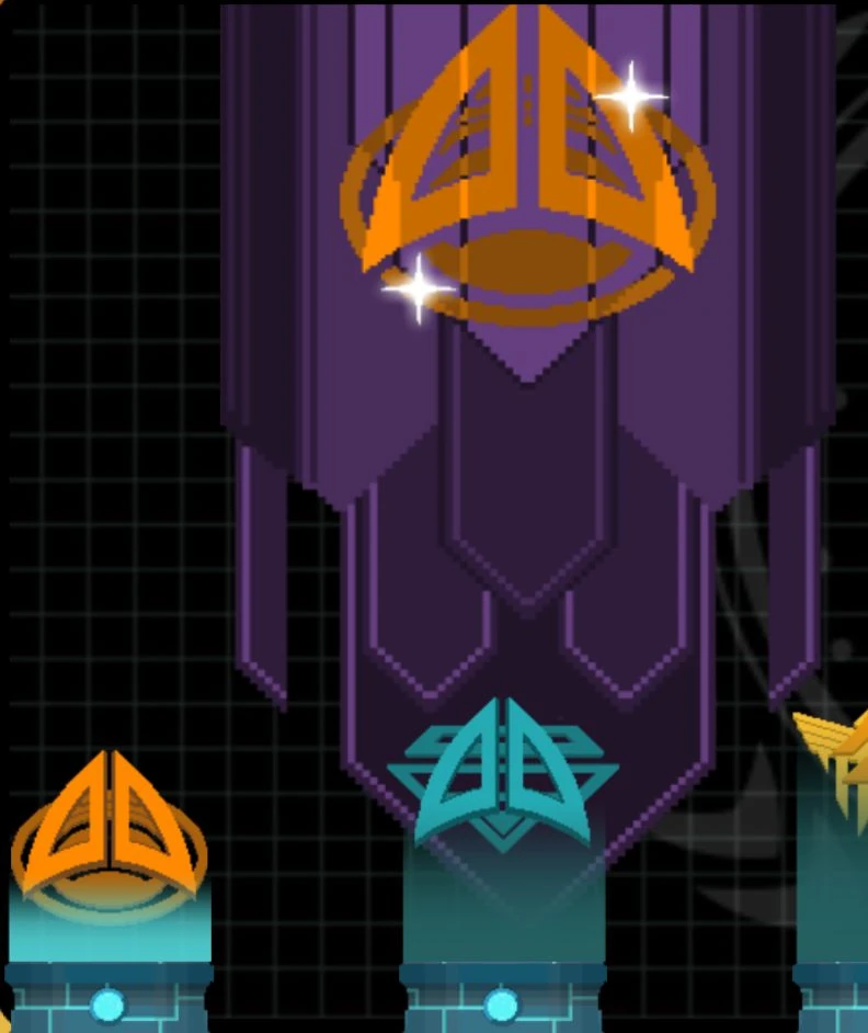 The insignia of Battle Group 1 was orange, and placed on a purple banner. The logo consisted of a rounded trapezoid, split in the middle, in front of a horizontally stretched circle. (ST video game: Trexels mission: "Skirmish")