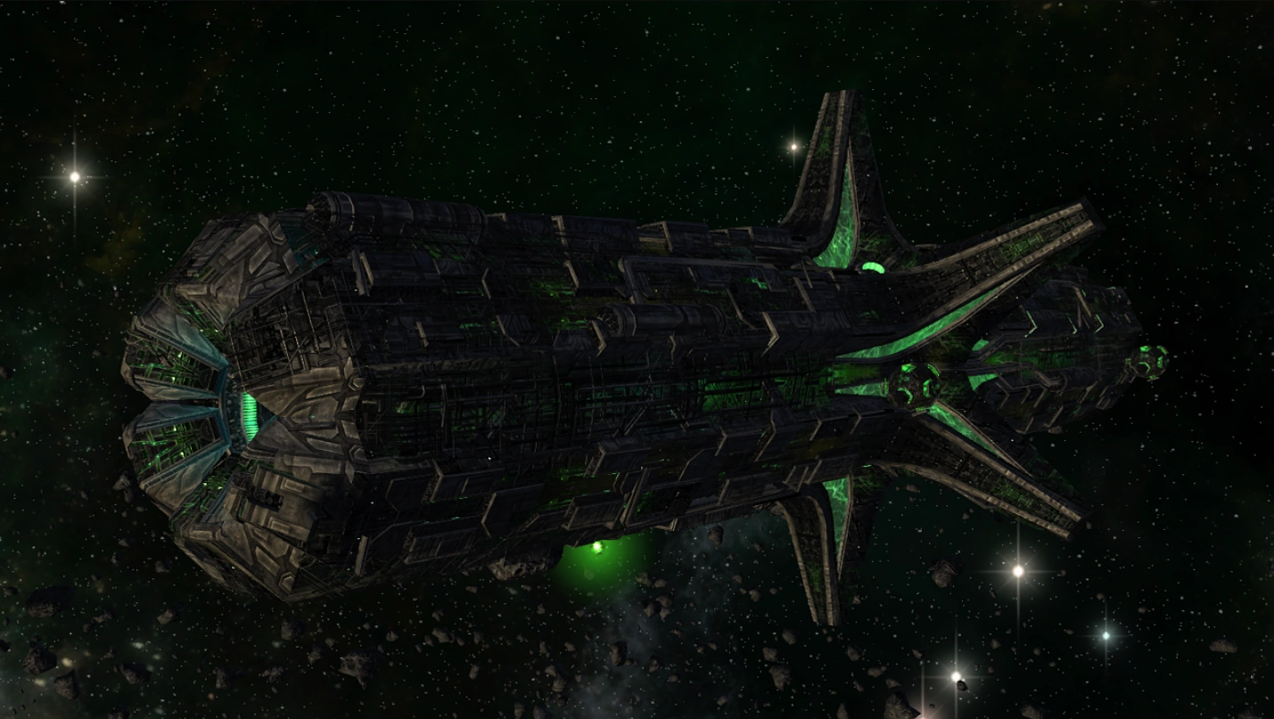 These vessels were significantly more powerful than the dreadnoughts of other races, but were less powerful than crystalline entities. Borg command ships were deployed from Unimatrix 0047 in a Borg invasion of the Alpha Quadrant and Beta Quadrant. (ST video game: Star Trek Online)
