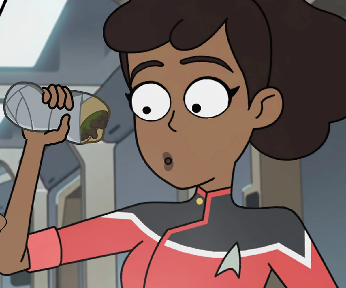 D'Vana Tendi dreamed that ship's personnel caught a libido-freeing virus. In her dream, Sam Rutherford and Barnes planned a burrito dinner. He attempted to reheat them with dilithium crystals. (LD video game: The Badgey Directive episode: "The Naked Later")