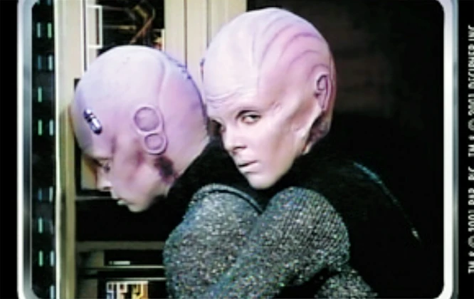 They are shorter in height than most humanoids and have lilac-colored skin and enlarged skulls. (TNG episode: "11001001")