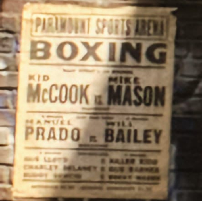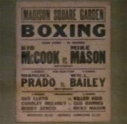 main event (10 rounds, heavyweights): Kid McCook vs. Mike Mason • semi-main event (6 rounds, heavyweights): Manuel Prado vs. Will Bailey • preliminaries (4 rounds): Gus Lloyd vs. Killer Kidd; Charley Mulaney vs. Gus Barnes; Buddy Sencio vs. Ricky Mason | |||||||||||||||||||||||||||||||||||||||||||||