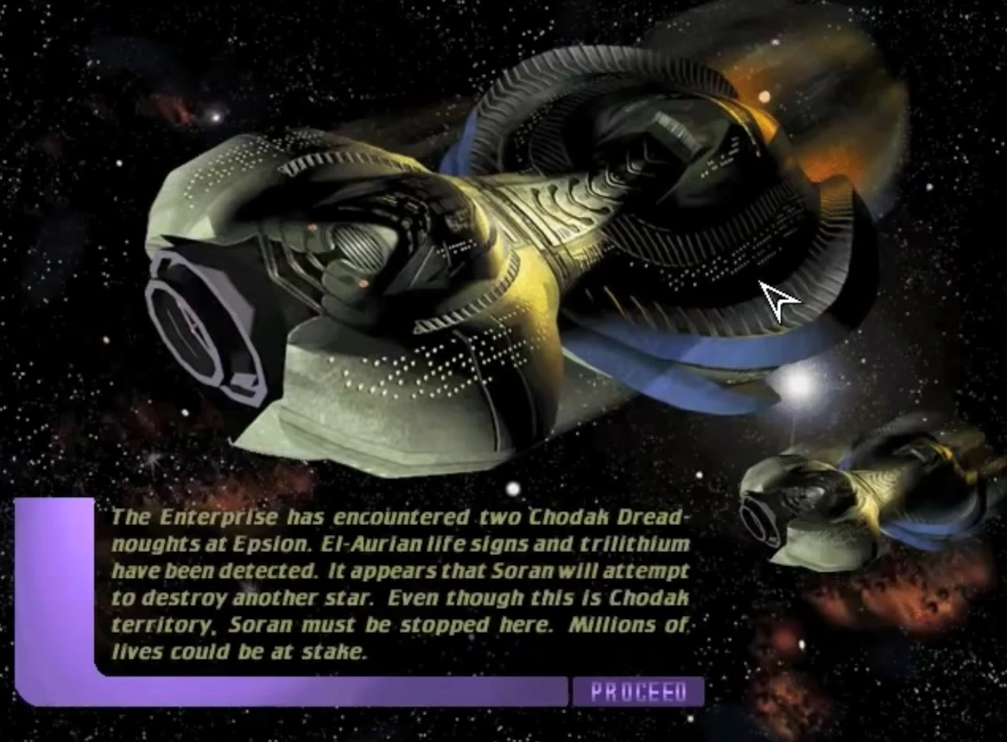 Later, in 2371, the Enterprise again encountered two of these formidable vessels in the Epsion star system while pursuing Doctor Tolian Soran. They may have been positioned there to defend or assist the Chodak outpost on Epsion II. (TNG video games: A Final Unity, Generations, Birth of the Federation)