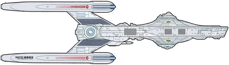 This class also mounted two impulse engine units in a vertical orientation between the nacelles in line with the saucer. Not altering the top sublight speed of the class, these redundant units—when used in concert with each other—gave the ship a huge advantage in acceleration and maneuverability.