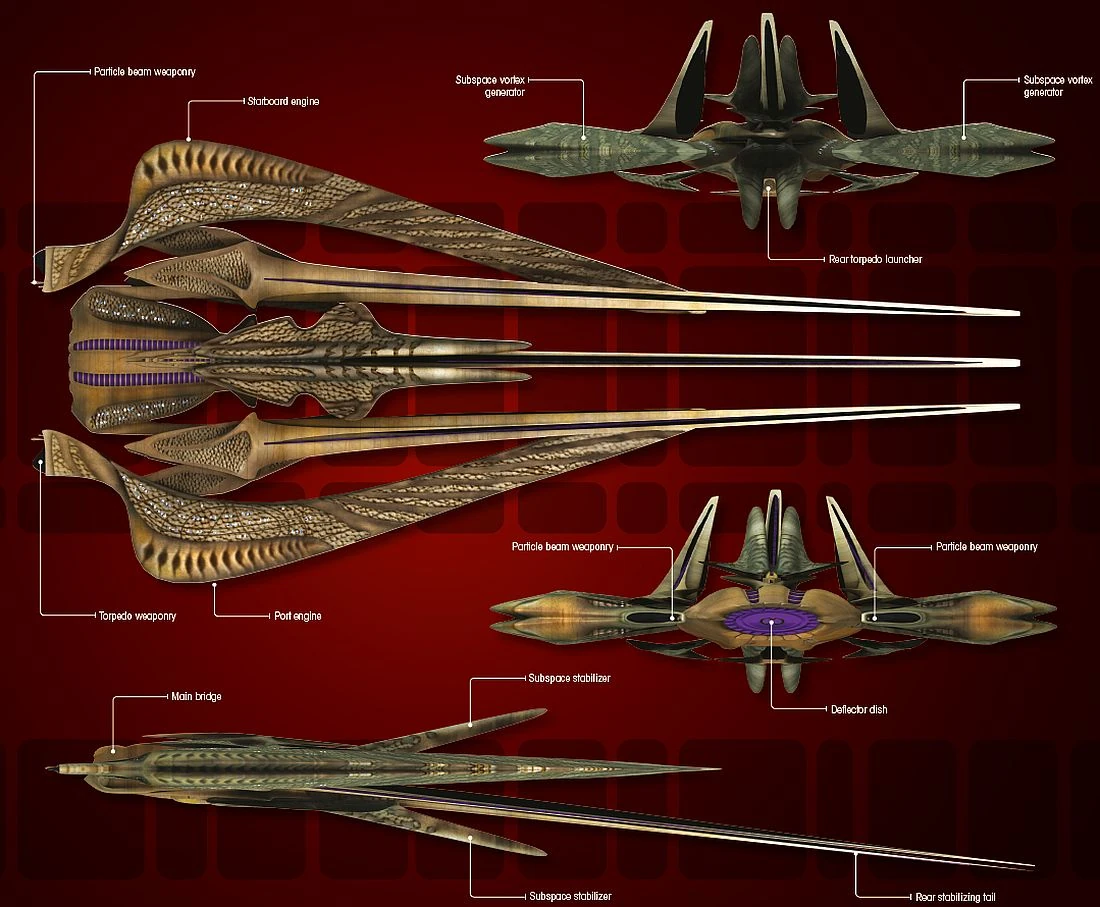 The Contortrix-class was a Xindi-Reptilian vessel in service since at least the 22nd century. During the 2150s the Contortrix-class served as warships. When the class was made available to Federation Starfleet and the Klingon Empire and the Romulan Republic respectively, it was reclassified an escort. (Star Trek: Enterprise; ST video game: Star Trek Online)