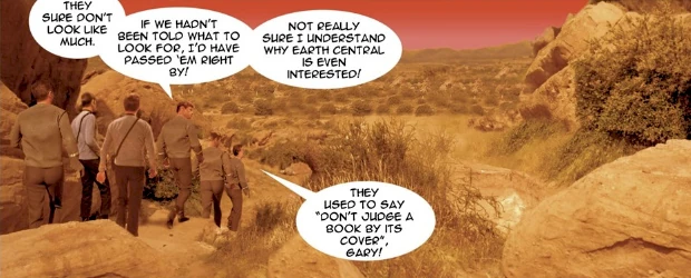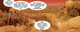 According to a conflicting account, the incident occurred in 2255, not long after Lieutenant Kirk's visit with Tyree on Neural. The USS Farragut responded to a distress call from an anthropological team sent three weeks earlier to study the natives. In this account, the Dimorusians were Human-sized, and the incident was resolved peacefully, with Mitchell cured by the natives. (TOS comic: "Gary")