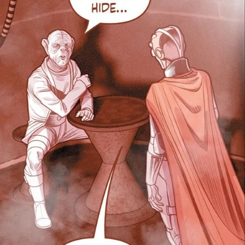 As a contact to Orion scavengers that crewed the OSS Scarab, Gron was considered a friend of their commander, Captain Nazzak, who addressed him as one and trusted the Yridian to operate as a middleman that established links with customers. One of these occasions was after the corsairs took considerable difficulties to purloin trilithium that their associate claimed to have located an individual willing to trade with them for. However, though Gron arranged for his allies to rendezvous with the propertied client at the western docking area on the Kor Neeron space station and received five isiks from them as his referral fee, the scene was devoid of life when Nazzak and his lieutenants arrived to conduct the transaction, leading to them concluding that the broker had mislead them about the emptor that Gron later claimed was a reliable source. Aware that the deal had fallen through in a manner that had embarrassed Nazzak, Gron then proceeded to make an unsuccessful effort to shelter within the corner of a diner, but was tracked down in short succession. Voicing denial to the accusation that he was hiding from Nazzak after his friend entered the establishment, the pirate took a seat beside Gron to discuss the treason. Making no comment to the initial description he was given about how the trilithium had been a difficult substance to acquire, when Nazzak went on to describe the absence of his buyer, Gron offered him a feeble show of perplexity, then tried to apologize for the failure of the deal after the privateer confronted him for having sold their friendship for the price of five isiks. Though the Yridian offered to remunerate his client for the failed deal, the Orion was merciless and proceeded to shot him through the face with a blaster, leaving the skull reduced to a bloodstained smear on the wall above the now-headless corpse.(DFT - Hell Is Only a Word comic: "Part 4"