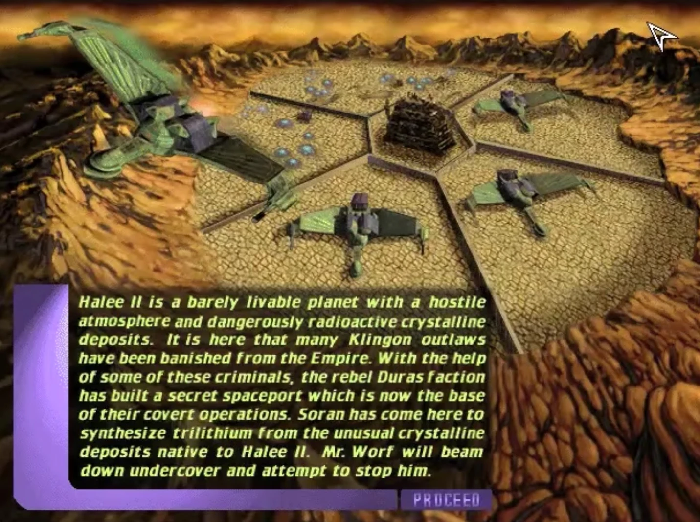 Halee II was a barely livable planet in the Halee system with a hostile atmosphere and dangerously radioactive crystalline deposits. It was here that many Klingon outlaws had been banished from the empire.