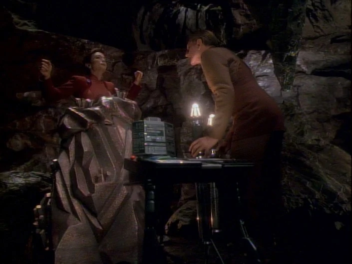 Major Kira and Odo are returning to Deep Space 9 aboard a runabout when they receive a message from a Lissepian ship that was attacked by the Maquis, Kira and Odo pursue the ship into the Badlands and land their runabout on a moon orbiting a gas giant planet. While searching for the sole Maquis, Kira traps her sport on a crystal in a cave and neither she nor Odo are able to free her. The crystal rapidly expands to cover more of Kira’s body. The moon itself is also prone to earthquakes, causing rocks from th e cavern to rain down on them. Fortunately, Odo is able to use his shapeshifting abilities to protect Kira. Even though further attempts to free Kira fail, Odo refuses to leave her and, with Kira’s death seems certain, Odo confesses his love for her. Kira reciprocates, but Odo finds this suspicious and realises that this is not Kira. Kira starts to to shapeshift and reveals herself as the Changeling that Odo met in the Gamma Quadrant. She has been researching why Odo chose to live with solids rather his own people and has realised it is because of his feelings for Kira. With Odo believing Kira to be dead, he would likely return home. The Changeling tells Odo where Kira is and the two escape aboard the runabout. Back on Deep Space 9, Odo tells Kira about the Changeling, but declines to reveal how he realised that she was not the real Kira.