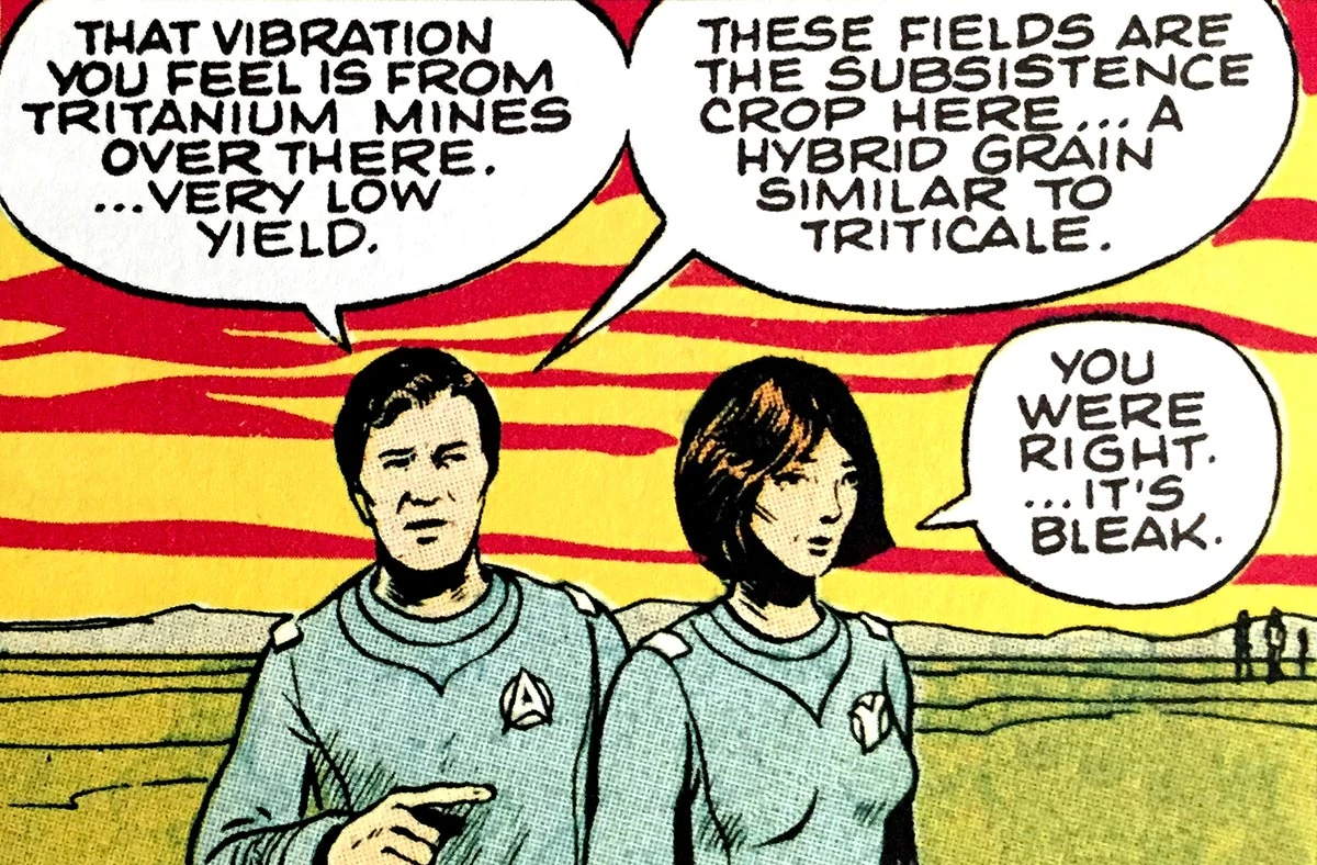 After repairs were complete, however, Husians abducted the crews of both ships, putting the men to work in a mine and the women to harvest grain. The men escaped by hiding within a maglev train used for removing ore, while the women set a blaze in the fields. The women found the men engaged in a phaser fight with Husians, and took advantage of the lower gravity to propel an enormous boulder down a cliff and turn the tide of battle. (TOS comic: "Husian Gambit")