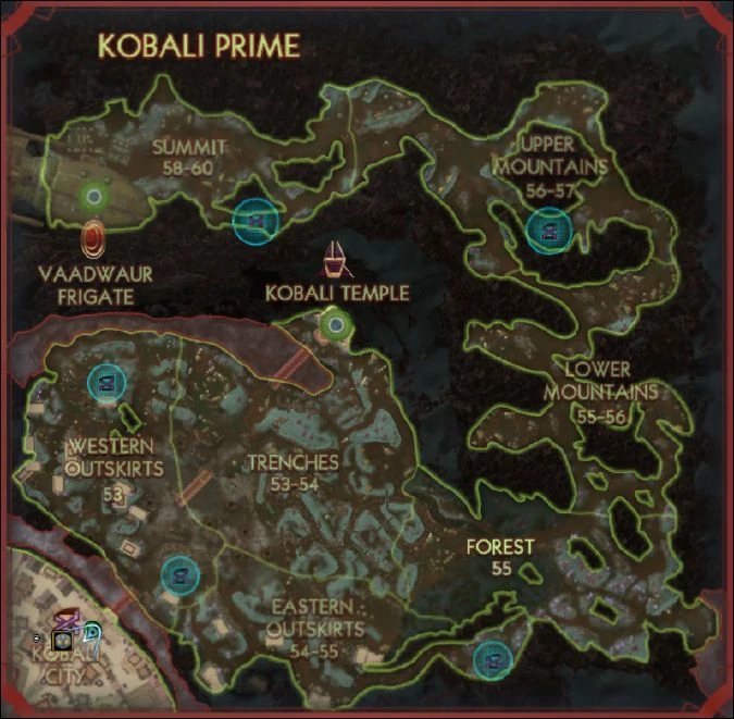 Kobali Prime presented itself as a lush world with green landmasses and blue oceans. Kobali City lay near a river and mountains. The Vaadwaur underground facility was invisible from the surface, and hidden under the Kobali Prime warzone. (STO - Delta Quadrant mission: "The Kobali Front")