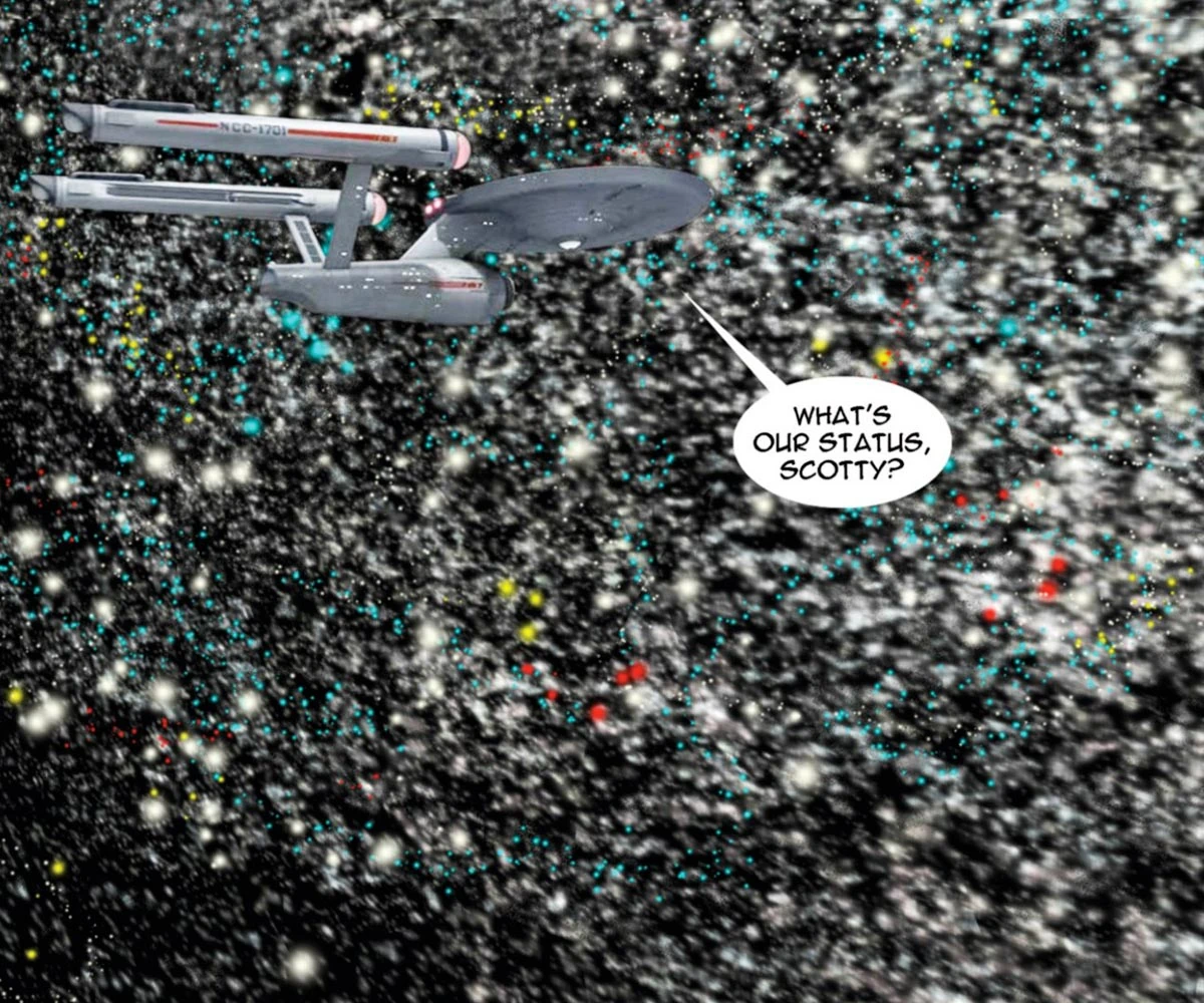 In 2268, the Federation starship USS Enterprise tracked a garbled transmission to the system. Ship's personnel located the remains of the Enterprise on Kroy's planet — it had mysteriously crashed there 1,170 years ago. (TOS - New Visions comic: "Time's Echo")