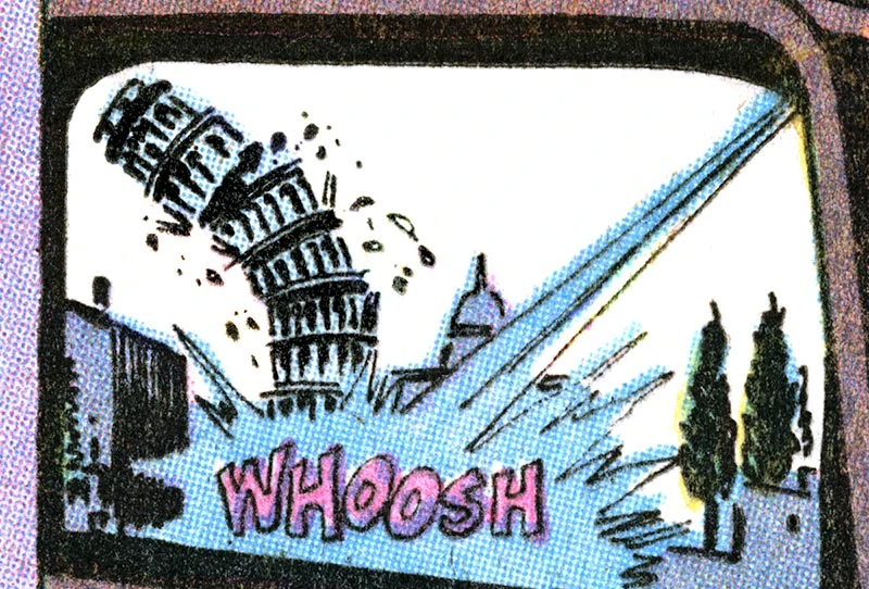 In the year 2266, the tower collapsed as the result of a sort of voodoo attack. Count Dressler fired a laser beam at a papier-mâché recreation of Earth and struck its own Leaning Tower, which collapsed, causing the real one to collapse at the exact same time on Earth. (TOS comic: "The Voodoo Planet")
