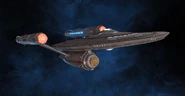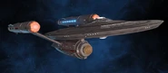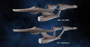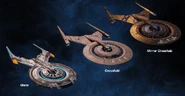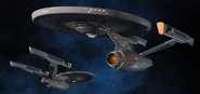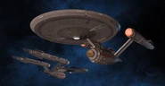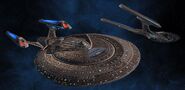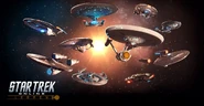 - "10th Anniversary Legendary Starship Bundles", published on the ARC website on 27 January 2020. The developer blog was written by Cryptic Studios community rep Mike "AmbassadorKael" Fatum. This blog introduces the legendary starship category. Ten iconic starships receive a facelift for the 10th anniversary of the game, released. At the time of the blog's release, the upcoming legendary command exploration cruiser and legendary pilot warship are revealed, while the other eight ship types remain shrouded by Odyssey-class silhouettes, until those were revealed as well. The dev blog includes a render of a USS Enterprise-D replica, the USS Defiant, and Odyssey-class shadows, heading away from a star. Below the image, the articles links to blog sub-pages focusing on each of the legendary ship types.