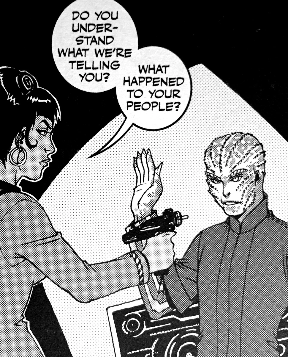 Twelve days after the genocide, Starfleet received a distress signal from Malur. Lieutenant Nyota Uhura of the USS Enterprise located a Malurian survivor who said he’d been on a prison transport during the attack, but that he didn’t kill his guard or the driver of the transport. The grifter said that four planets' worth of goods were his to sell, and his distress signal contained a hidden second signal: a global estate sale. As a compromise to bringing him back to Starfleet, the survivor agreed to look for other off-planet survivors using his communications technology, with a relay set up to direct survivors back home. Captain Kirk said an ambassador would review the case of the survivor’s estate sale. (TOS - Kakan ni Shinkou comic: "Communications Breakdown")