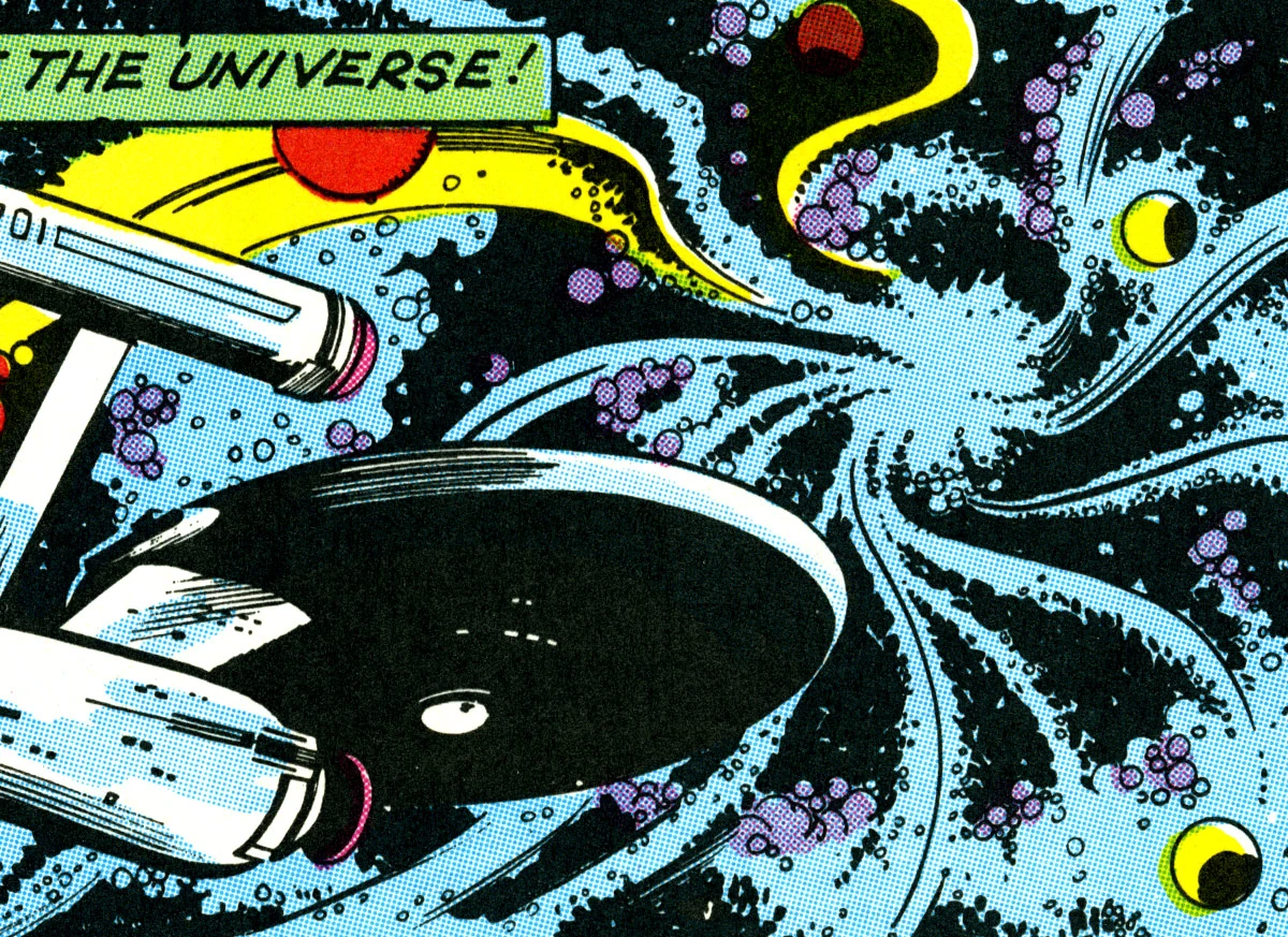 In the 2260s, scientists speculated that quadrant Mark 1 once contained the singularity which exploded to create the universe. The USS Enterprise was dispatched to investigate. At one point, space simply seemed to run out as the vessel slipped into a subspace parallel universe. Spock theorized that they might be within the primordial atom, a region of matter which existed outside of normal spacetime. Within the region, some of the laws of nature acted differently and thoughts seemed to have a power all their own. The Enterprise crew discovered within a stasis chamber the James T. Kirk not from their universe, but from the universe which existed before it, as well as a duplicate USS Enterprise decoy which he could control with telepathy. The Enterprise was able to return to the prime universe by amplifying thoughts with a cybernetic helmet worn by Nova. (TOS comic: "The Choice")