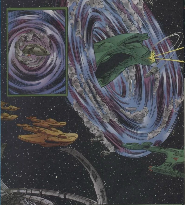 Bashir finds Koleth in a mind probe device and freeing him, they make their way to the runabout while chased by Romulans. Odo transports them aboard and they leave the atmosphere of the planet. A Romulan Warbird in orbit of the planet gives chase to the runabout who heads to the Bajoran wormhole. At the station more Klingon ship enter the system. When all seems lost the wormhole opens up and the Orinoco comes through followed by the Romulan ship which is greeted by the disruptor fire of the Klingon fleet.