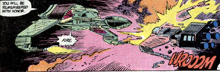 At the rendezvous, Valkris transmitted Kirk's report to Kruge, and stated that he would find the report useful. Upon realizing that she had seen the data, Kruge had his ship to attack and destroy the Merchantman. (TOS movie, novelization & comic adaptation: The Search for Spock)