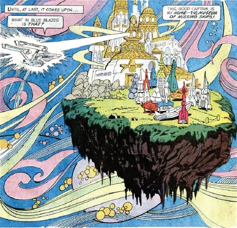The Museum of Missing Ships was a museum on Krugar III, run by a man known as the Curator. When the planet was destroyed by a comet, the section of land containing the museum was blown clear. It subsequently fell into a netherspace, where time did not exist. Over the years, a number of lost starships and their pilots ended up in the Museum. In 2266, the museum was destroyed when the netherspace exploded at the end of its natural cycle. The USS Enterprise and a Klingon starship were able to blast their way free in time, but the inhabitants of the Museum chose to remain and die. (TOS comic: "Museum at the End of Time")