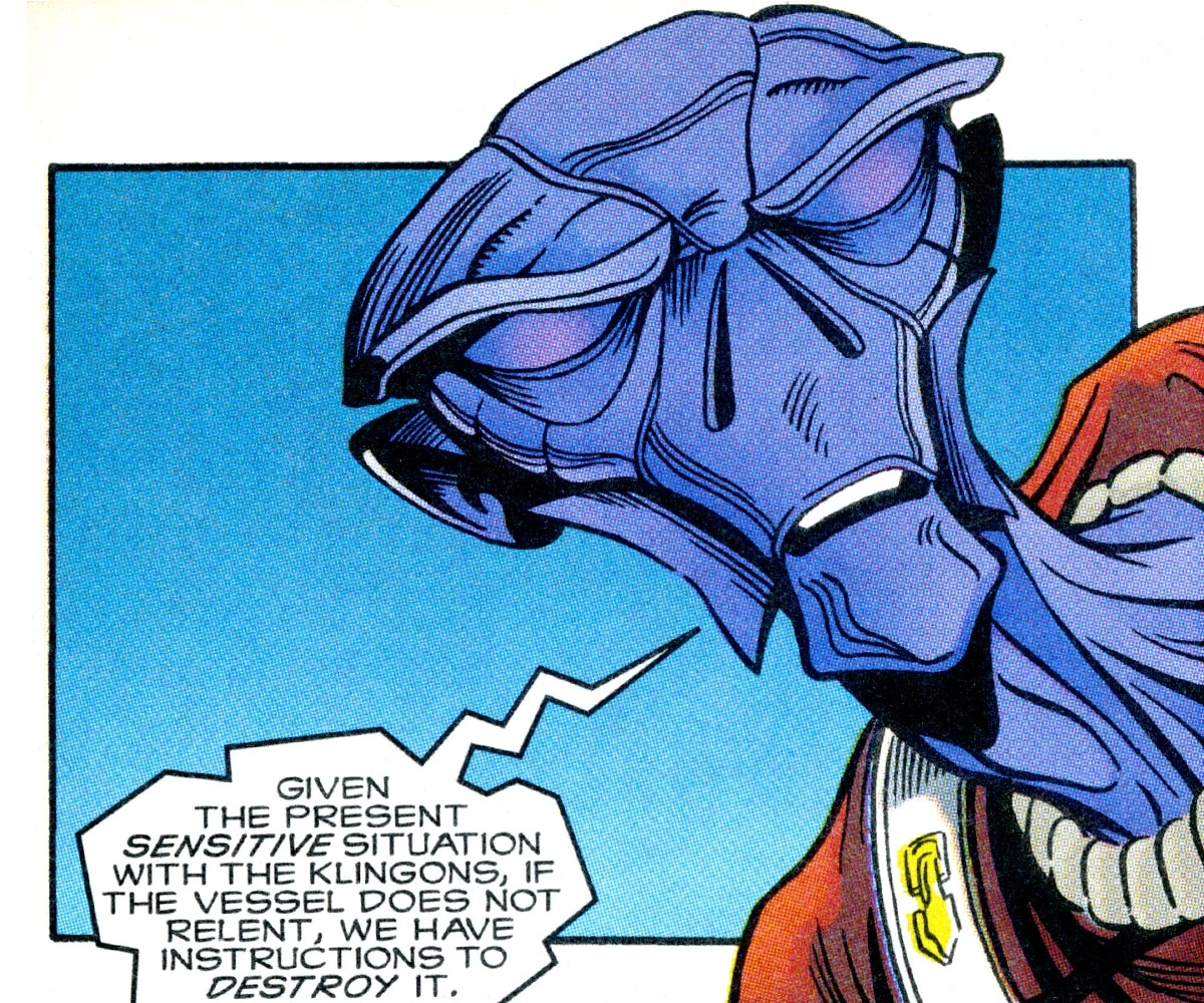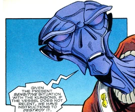 Shortly afterwards, he was among the crew taking shore leave on Rigel VII on the eve of the planet's admission into the Federation. Unfortunately rogue elements of the Rigellian warrior caste, the Kaylar, were not content to let their traditions die out, and began a coup. Crewpersons from the Enterprise were attacked, and Nano received a head wound — damaging his chitin — while he was distracted using his pyrotechnic abilities to save Spock from a Kaylar attack. Nevertheless, Nano was still sufficiently functional to modify a communicator so that Yeoman Dermot Cusack could track down a Rigellian jamming-device and call in aid from the Enterprise. (EV comic: "Our Dearest Blood")