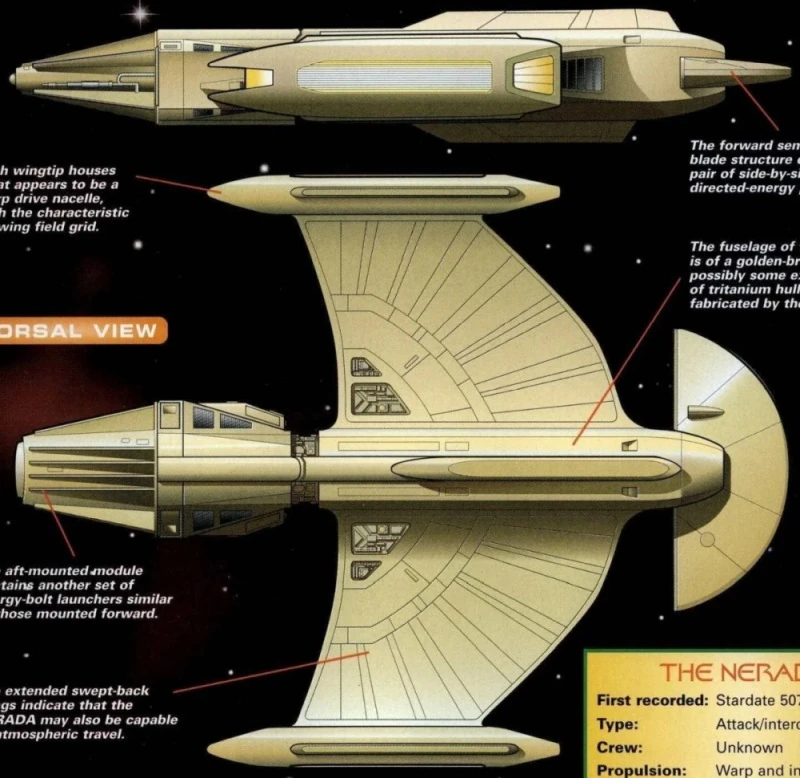 The wing design indicated atmospheric travel capability. The defense system consisted of standard shields. The weapon systems were twin forward directed energy weapon projectors and aft-mounted energy bolt launcher. The aft weapon launcher fired similar armaments to the forward mounted weapons. (Fact Files Issue 88: "File 40 Card 48 The Nerada")