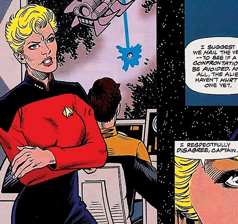By the year 2370, she was in command of the Federation starship USS Hornet and had deviated from her mission to reach a Tetryon anomaly that she suspected might have been a portal to the subspace realm from which the Solanae originated. (TNG comic: "Gateway")