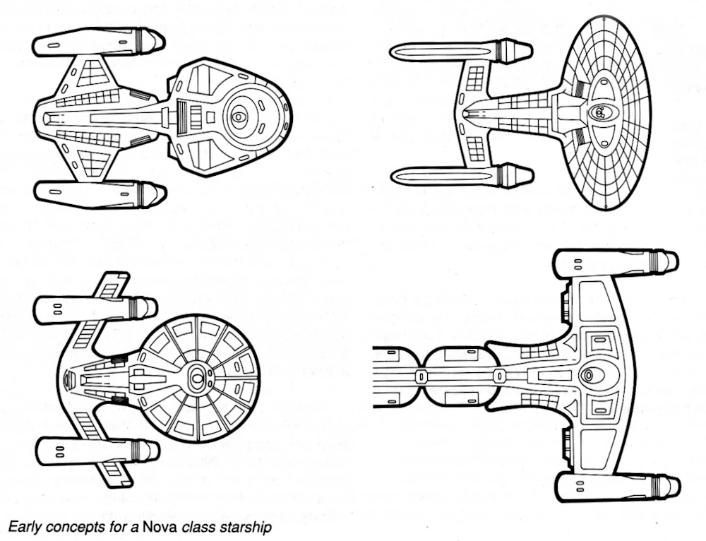 The name "Nova-class" was coined for a new Starfleet design in the 2360s. At the time of its inception, it was being modeled as the next evolution of the explorer design dynamic of the Galaxy-class. At least four designs were conceptualized for the new class; with a variety of innovative new arrangements, propulsion systems and modular designs proposed. One radical design featured a nacelles-forward central hull that would trail mission modules behind it. Another design maintained a more typical Starfleet arrangement, but distorted to make use of anticipated advances in warp technology to allow greater z-axis warp field compression. A third design also maintained a recognizable silhouette, but proposed variable geometry warp nacelles and a primary hull that was composed of interchangeable modules. The fourth design had entered service by 2370, as evidenced by the USS Aquitaine; like the Nova-class, of another design which had gone into production by 2368, this design featured an angular, almost triangular, primary hull, and was used as a small explorer and research vessel. (TNG reference: Star Trek: The Next Generation Technical Manual; TNG comics: "Children of Chaos", "Mother of Madness", "Brothers in Darkness")