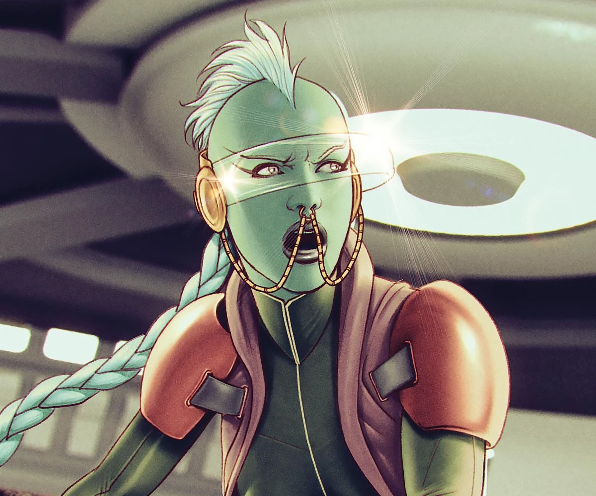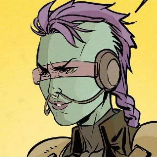 Nymira[2] Vondect[1], also referred to as 'X', was a female Orion field medic, non-commissioned officer and pirate that was active in 2370s. A former corporal inside the Orion Infantry, she was credited for the creation of treatments which decreased the cellular decline of those who were victims of the isotopic weapons that rebel forces deployed against her side. Though she saw action inside the Orion Nebula, Vondect was discharged from service after she began euthanising near-dead soldiers to end their suffering, including the son of her superior officer. Sentenced to a labour camp, Nymira escaped besides an older prisoner who committed suicide before her. After falling into hard times, she was recruited to the scavenger crew under Captain Nazzak, but later defected to join a makeshift team assembled by Ambassador Worf to stop Emperor Kahless and his cult of followers, the Red Path, despite initial refusals to give up her name, and took part in thwarting the Day of Blood, where she helped to save the life of Chancellor Martok alongside Doctor Beverly Crusher and Commander Sela. After this event, Vondect continued to work alongside her teammates when Starfleet recruited them as bounty hunters that were tasked with capturing three individuals that the Federation wanted, but over the course of their mission, she and her female comrades — B'Elanna Torres and Ro Laren — aired their disillusionment with the United Federation of Planets to Worf. After successfully apprehending their targets, however, the team discovered that Starbase 99 had been infected with a parasite invasion and to prevent the infestation from spreading, the Orion sacrificed herself to destroy the interdimensional doorway and save her teammates, bidding them what was believed to be a final farewell.[3] Unbeknownst to her teammates, however, Vondect was saved by one of those that she had helped capture, Berlinghoff Rasmussen, who she formed a partnership with.[4]