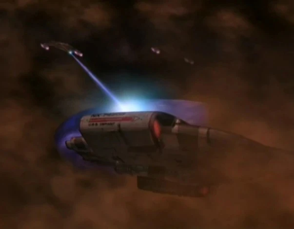 A Jem'Hadar fighter firing a polaron beam weapon at the USS Defiant (NX-74205).