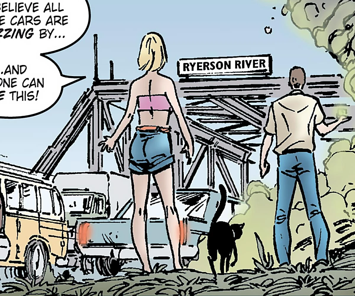 In 1971, Gary Seven and Roberta Lincoln followed the agents' route using a level-9 bioscan and saw a replay of the crash against the bridge by the river. Obviously not an accident, Seven and Lincoln proceeded to the sheriff's office to investigate further. (TOS - Assignment: Earth comic: "We Have Met the Enemy...")