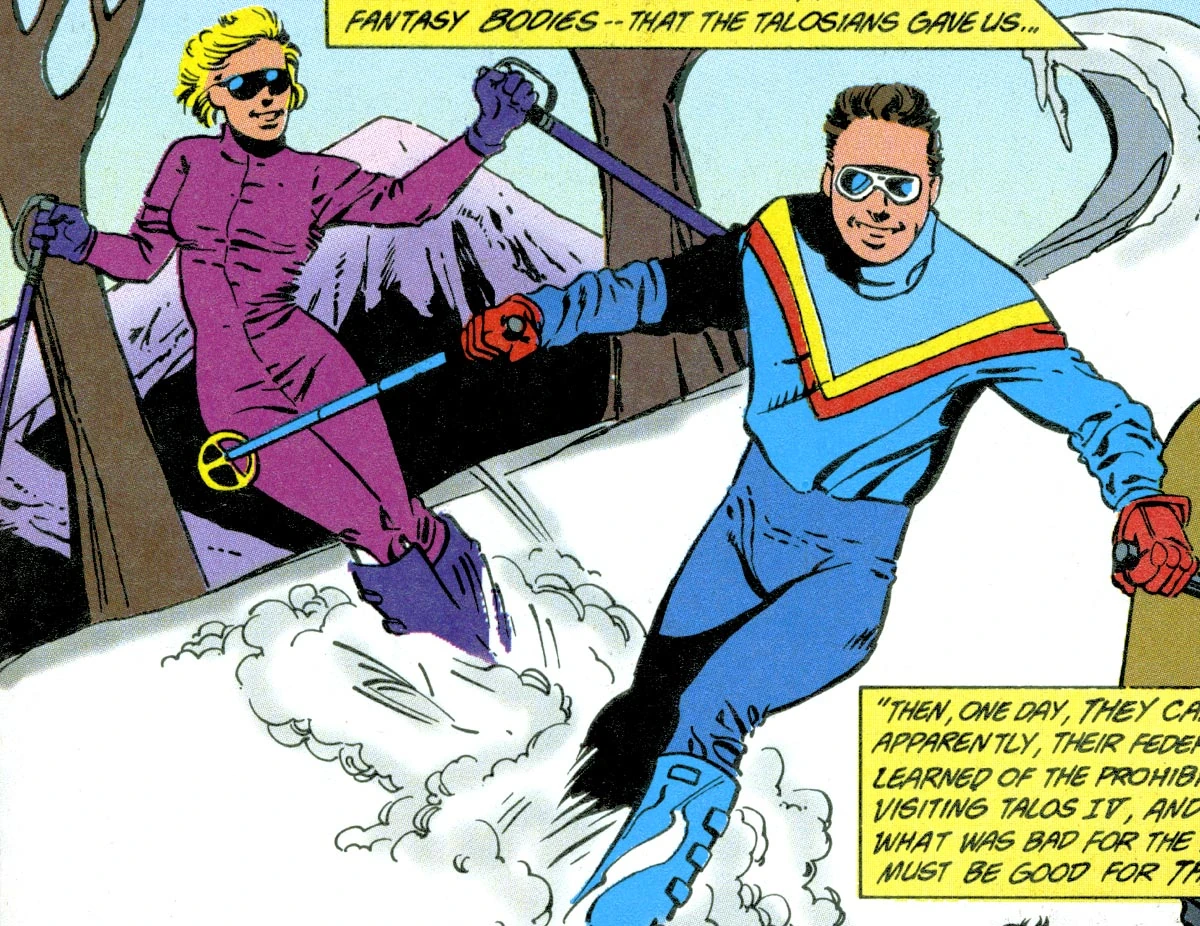 Vina and Christopher Pike enjoyed skiing in one of the many Talosian illusions. (TOS - Annual comic: "The Final Voyage")