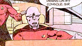 In the year 2364, Skootch acted as Data's relief at the operations manager bridge station. A humanoid with pinkish skin, a bald scalp and a pronounced brow, Skootch confirmed that Data's used of the slang term "ditto" was correct as the android left to go to the ship's Christmas party. Skootch remained at this position during an encounter with the Creeg and was present when the energy spirit pursued by the Creeg appeared on the bridge. (TNG comic: "Spirit in the Sky!")