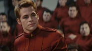 On the Kelvin the crew react as their captain's lifesigns terminate. The Narada's attack resumes. Kirk orders the crew to abandon ship, including his wife, Winona, who is on the verge of giving birth to their son. Kirk puts the Kelvin on a collision course, but the autopilot is offline, so he is forced to stay behind to manually pilot the ship; he sets the ship's self destruct mechanism to go off simultaneously with the collision, hoping to disable the attacking vessel long enough to let the crew escape. On Medical Shuttle 37 Winona gives birth, and in the last few moments of George's life they decide on a name for their son over the comm system: Jim, after Winona's father.