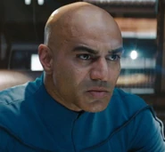 The Narada engages the Enterprise in battle, but when Nero recognizes the newly arrived ship he orders that it not be destroyed yet. Nero hails the Enterprise, making sure to single out Spock, and when questioned on how he knows the Vulcan, comments that they do not know each other, yet. He then demands that Pike take a shuttle to Narada for negotiations. Pike agrees, but takes Kirk and Sulu, who has advanced combat training, with him. They are joined in the shuttlebay by Chief Engineer Olson, who will perform a space-jump with Kirk and Sulu from the shuttle to the drilling platform in order to disable it. Pike leaves Spock in command of the ship, and promotes Kirk to first officer to maintain the chain of command. Because Dr. Puri was killed in the Narada's initial attack, McCoy becomes Chief Medical Officer. As the shuttle arcs toward Narada, Olson, Kirk and Sulu make the drop. Sulu and Kirk deploy their chutes at almost the same time, but Olson delays in order to reach the drill first. He hits the platform too fast and falls over the edge, then is incinerated in the column of plasma below.