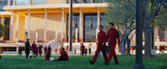 In Hangar One the cadets are given their assignments. In light of the distress call the cadets are to report to duty immediately, ahead of their formal graduation. The cadets' names and postings are read out, but Kirk's is not on the list; pending the outcome of the hearing he is grounded. McCoy prepares to leave, but then has an idea and drags Kirk off. They pass Uhura, who is somewhat irritated due to her being assigned to the Farragut despite her desire (and ample qualifications) to be posted on the Enterprise. She complains to Spock, who explains he wished "to avoid the appearance of favoritism", but Uhura insists she is serving on the Enterprise, and after a couple of pokes to his readout, Spock agrees.