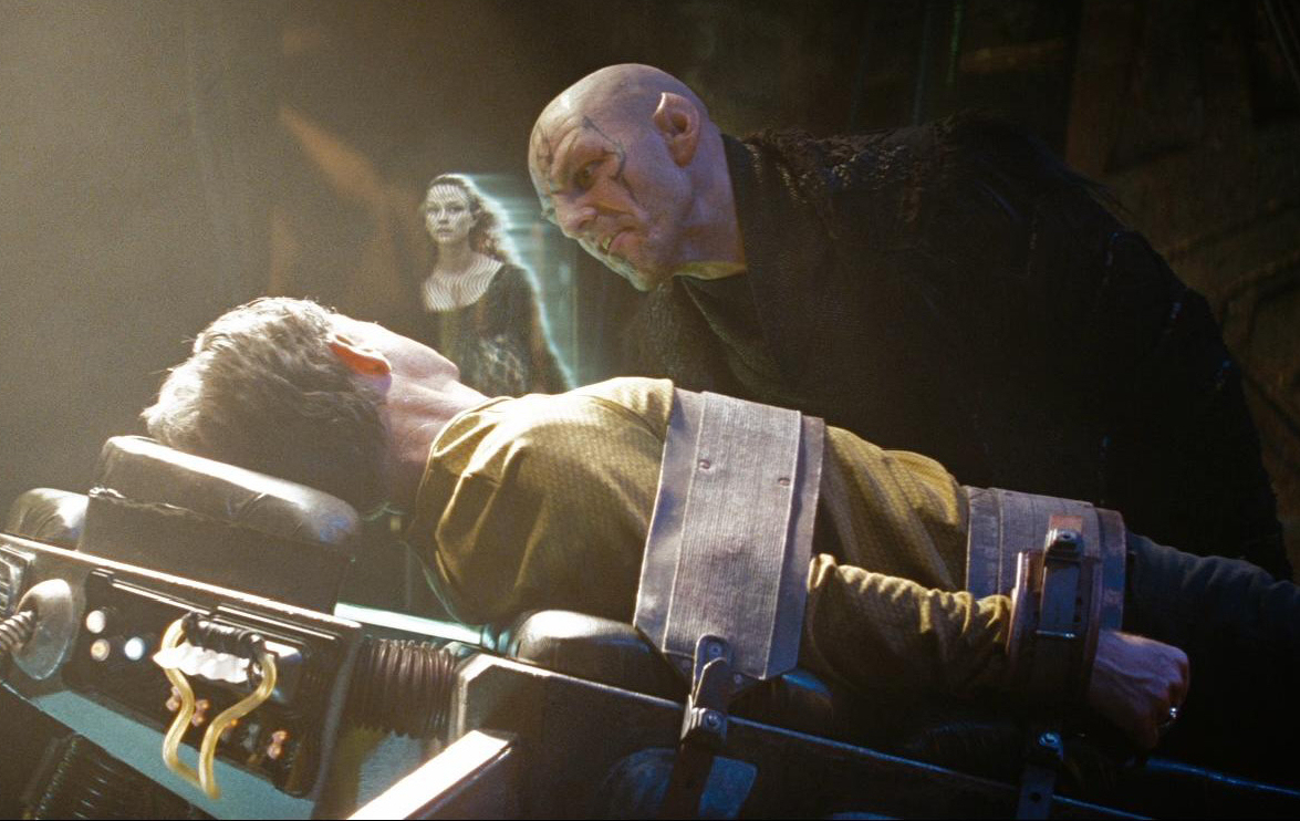On the Narada, Pike refuses to give Nero the frequencies that warn Earth of hostile intrusion. Nero explains that he is avenging the destruction of Romulus and the deaths of his wife and unborn child -- confusing Pike, since Romulus has not been destroyed. A Centaurian slug is inserted into Pike's mouth which will wrap itself around his spinal cord and force him to tell the truth.