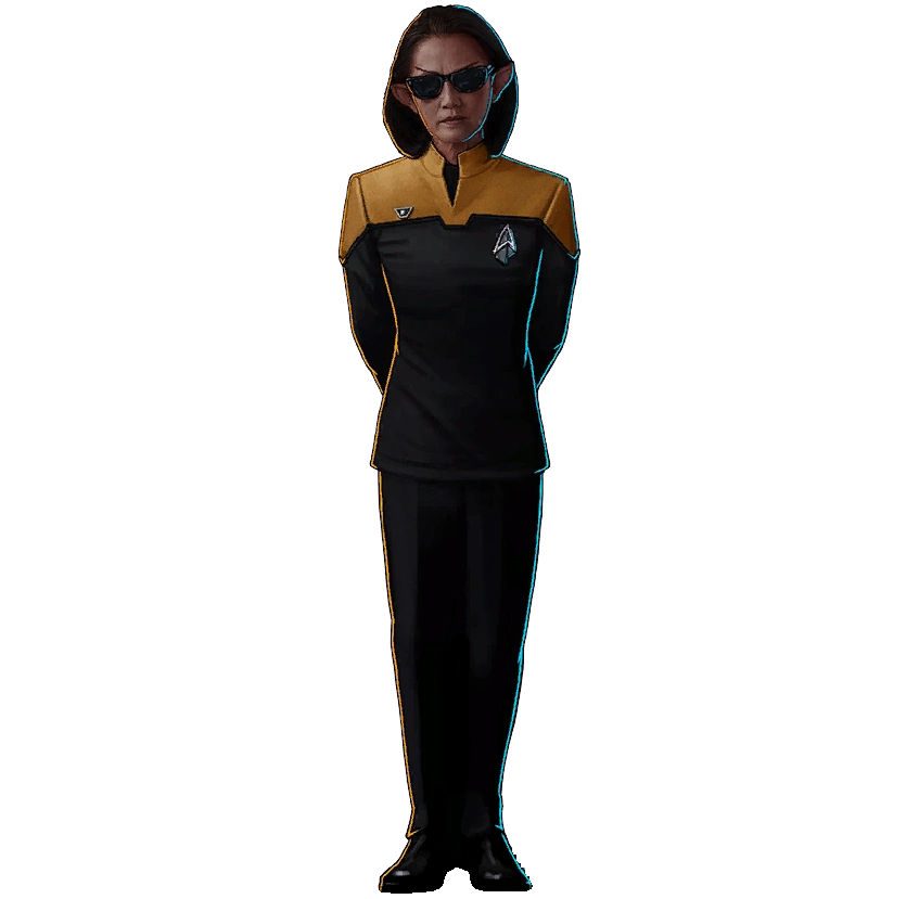 In a timeline thrown into chaos by the temporal anomaly crisis in the early 2380s, duplicates of primary universe officers emerged and joined Starfleet's and Q's efforts to resolve the crisis. These included the 2399 versions of William T. Riker, Kirsten Clancy, and "Commodore Oh", who wore their SF 2399 uniforms. Oh added sunglasses to her outfit. (ST video game: Timelines)