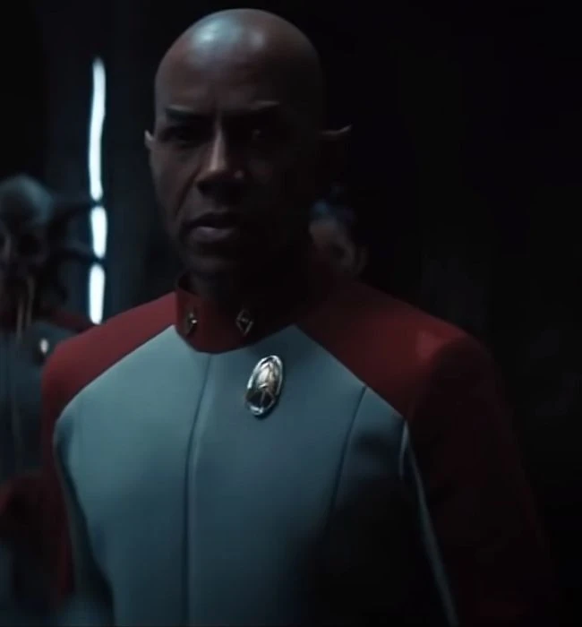 Captains[6] and flag officers[7] wore a different style of badge that did not indicate rank. The uniforms of the captains attending Kaminar's induction ceremony matched that of the 2260s-era cadets, with a grey body and red shoulders and collar. In the 3180s, Admiral Senna Tal wore a grey outfit with shoulder flaps reaching down the front of the torso, a thin red trim, and shoulder epaulets with six chevrons indicating seniority. (DSC episodes: "Forget Me Not", "Su'Kal")