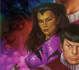 In 2257, she was assigned to one of the construction teams building the new watchtower outpost stations along the Romulan Neutral Zone. After her team was wiped out, T'Cel was taken on board the USS Farragut to assist Lt. James T. Kirk in repairing the main sensor array following the Dikironium cloud creature's attack.[1] When the Farragut was under attack by a extra-dimensional being's creature-carrying projectiles. T'Cel and Kirk then fought their way past the creatures while attempting to reach the saucer section. As they made their way out, T'Cel was attacked by one of the creatures. She was then saved by Kirk when he tackled the creature. T'Cel then took Kirk to a escape pod and tended to his critical wounds after the Farragut was destroyed. T'Cel was able to plot a course to one of the watchtower stations near the neutral zone. However, she assumed and saw that the Romulans had sent a bird-of-prey. To save Kirk, T'Cel decided to put him in a stasis tube to keep him alive and shield him from the sensor probe. T'Cel decided to flee with the pod and give the Romulans an easy target. Before leaving Kirk, T'Cel promised that she shall not see him die and to live long and prosper.