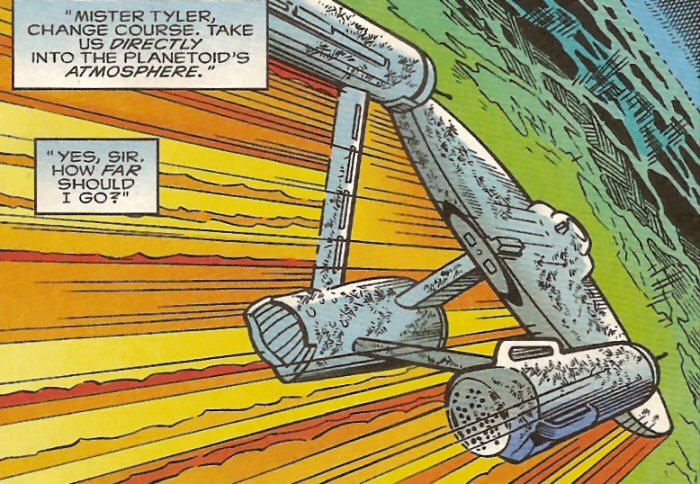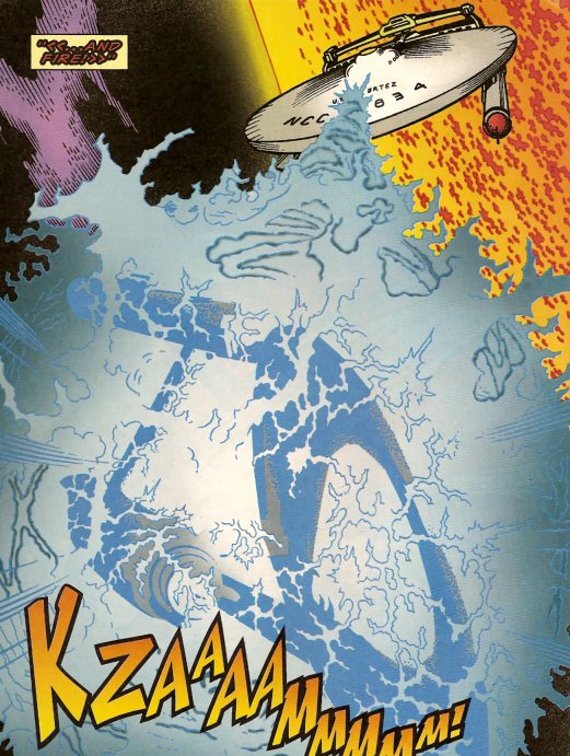 Shortly after, the Cortez was destroyed by another Vulcan weapon fired from the planetoid. Captain Pike then ordered the Enterprise into the planetoid's atmosphere to rescue a landing party, unable to beam them up due to atmospheric interference before the planet is destroyed by the very same Vulcan weapon that fired on the Cortez. (EV comic: "Cloak and Dagger") Following the incident the Enterprise spent a week at Deep Space Station K-12 under going repairs. (EV comic: "The Flat, Gold Forever")